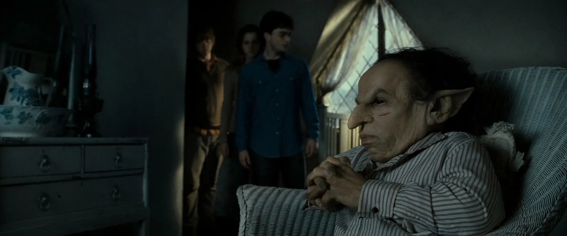 Cast: Daniel Radcliffe as Harry Potter, Rupert Grint as Ron Weasley, Emma Watson as Hermione Granger, Ralph Fiennes as Lord Voldemort, Alan Rickman as Severus Snape, Helena Bonham Carter as Bellatrix Lestrange, Maggie Smith as Minerva McGonagall, Michael Gambon as Albus Dumbledore, John Hurt as Ollivander, Tom Felton as Draco Malfoy, Warwick Davis as Griphook / Filius Flitwick, Robbie Coltrane as Rubeus Hagrid, Jason Isaacs as Lucius Malfoy, Kelly Macdonald as Helena Ravenclaw, Gary Oldman as Sirius Black, David Thewlis as Remus Lupin, David Bradley as Argus Filch, Ciarán Hinds as Aberforth Dumbledore, Gemma Jones as Poppy Pomfrey, Dave Legeno as Fenrir Greyback, Miriam Margolyes as Pomona Sprout, Helen McCrory as Narcissa Malfoy, Nick Moran as Scabior, James Phelps as Fred Weasley, Oliver Phelps as George Weasley, Clémence Poésy as Fleur Delacour, Natalia Tena as Nymphadora Tonks, Julie Walters as Molly Weasley, Mark Williams as Arthur Weasley, Bonnie Wright as Ginny Weasley, Evanna Lynch as Luna Lovegood, Domhnall Gleeson as Bill Weasley, Graham Duff as Death Eater, Anthony Allgood as Gringotts Guard, Rusty Goffe as Aged Gringotts Goblin, Jon Key as Bogrod, Ian Peck as Hogsmeade Death Eater, Benn Northover as Hogsmeade Death Eater, Hebe Beardsall as Ariana Dumbledore, Matthew Lewis as Neville Longbottom, Devon Murray as Seamus Finnigan, Jessie Cave as Lavender Brown, Afshan Azad as Padma Patil, Isabella Laughland as Leanne, Anna Shaffer as Romilda Vane, Georgina Leonidas as Katie Bell, Freddie Stroma as Cormac McLaggen, Alfred Enoch as Dean Thomas, Katie Leung as Cho Chang, William Melling as Nigel Wolpert, Sian Grace Phillips as Screaming Girl, Ralph Ineson as Amycus Carrow, Suzie Toase as Alecto Carrow, Jim Broadbent as Horace Slughorn, Scarlett Hefner as Pansy Parkinson, Josh Herdman as Gregory Goyle, Louis Cordice as Blaise Zabini, Amber Evans as Twin Girl 1, Ruby Evans as Twin Girl 2, George Harris as Kingsley Shacklebolt, Chris Rankin as Percy Weasley, Guy Henry as Pius Thicknesse, Phil Wright as Giant, Gary Sayer as Giant, Tony Adkins as Giant, Penelope McGhie as Death Eater, Emma Thompson as Sybill Trelawney, Ellie Darcey-Alden as Young Lily Potter, Ariella Paradise as Young Petunia Dursley, Benedict Clarke as Young Severus Snape, Leslie Phillips as The Sorting Hat (voice), Alfie McIlwain as Young James Potter, Rohan Gotobed as Young Sirius Black, Geraldine Somerville as Lily Potter, Adrian Rawlins as James Potter, Toby Papworth as Baby Harry Potter, Timothy Spall as Peter Pettigrew, Peter G. Reed as Death Eater, Judith Sharp as Death Eater, Emil Hostina as Death Eater, Bob Yves Van Hellenberg Hubar as Death Eater, Granville Saxton as Death Eater, Tony Kirwood as Death Eater, Ashley McGuire as Death Eater, Arthur Bowen as Albus Severus Potter (19 Years Later), Daphne de Beistegui as Lily Luna Potter (19 Years Later), Will Dunn as James Sirius Potter (19 Years Later), Jade Gordon as Astoria Malfoy (19 Years Later), Bertie Gilbert as Scorpius Malfoy (19 Years Later), Helena Barlow as Rose Weasley (19 Years Later), Ryan Turner as Hugo Weasley (19 Years Later), Paul Bailey as Gryffindor Student (uncredited), Sean Biggerstaff as Oliver Wood (uncredited), Vinnie Clarke as Gryffindor Student (uncredited), David Heyman as Dining Wizard in Painting (uncredited), Charlie Hobbs as Student (uncredited), Luke Newberry as Teddy Lupin (uncredited), Keijo J. Salmela as Gringotts Goblin (uncredited), Pauline Stone as Nurse Wainscott (uncredited), Spencer Wilding as Knight of Hogwarts (uncredited), Harrison Davis as Gringotts Goblin (uncredited), Annabelle Davis as Gringotts Goblin (uncredited)